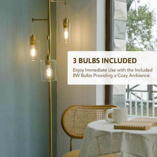 Bestco Industrial Floor Lamp with 3 LED Bulbs Hanging Glass Shades 64" Metal Pole Gold